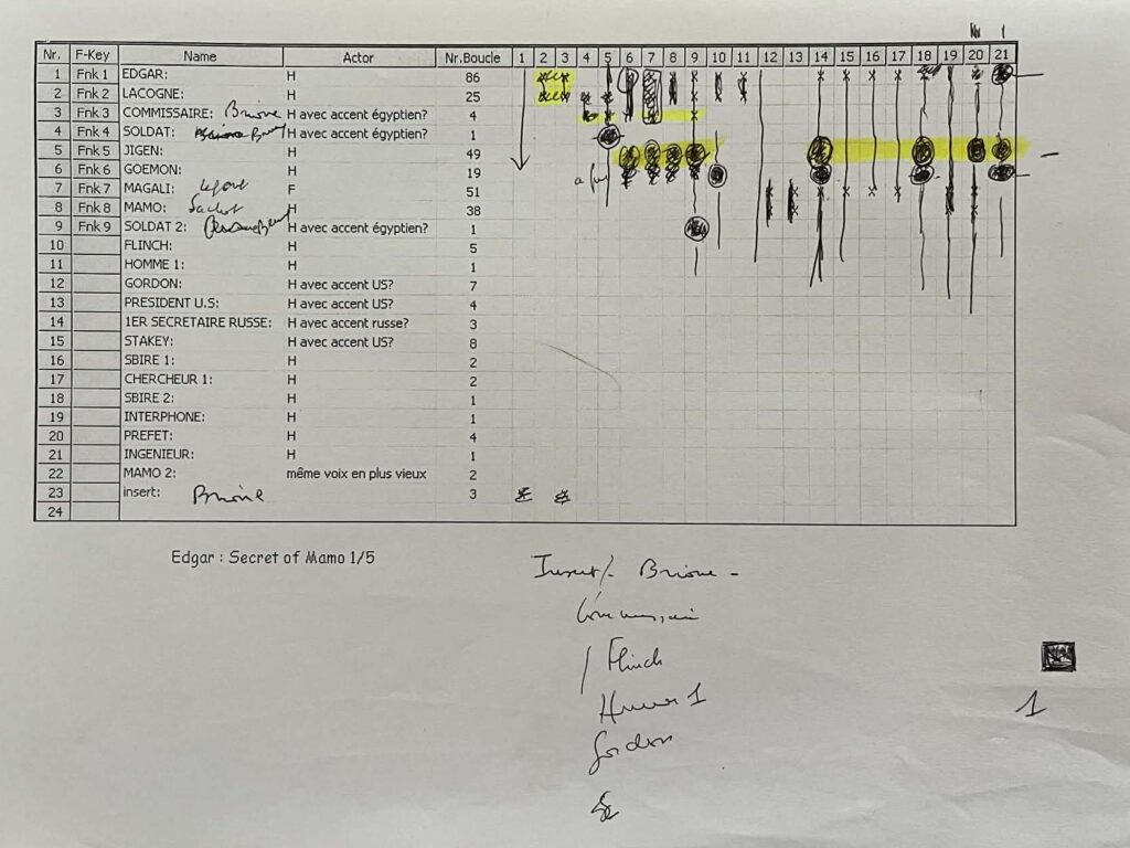 Merci d’avoir lu (ou relu) cet article jusqu’au bout. Depuis sa sortie initiale, quelques ajouts ont été effectués. Grâce aux témoignages de Thierry Bourdon et Patrick Borg, j’ai pu rajouté quelques éléments supplémentaires concernant André Chelossi qui permettent de mieux comprendre qui était cette personne, dont j’ai découvert qu’elle était loin d’être une personne aussi anodine que ce que j’aurai pu me douter au départ dans le milieu du doublage. De plus, grâce à Camille Rosset (que je remercie), une piste d’explication semble s’être ouverte concernant la présence de la chanson Planet O en fin de film sur la version française du film (avec potentiellement un problème de droit). Enfin, grâce à Olivier Fallaix, qui a retrouvé ce document dans ses archives, je peux désormais vous proposer une image issu de sa collection, où l’on voit quelques informations concernant les boucles enregistrés au moment du second doublage et leur répartition, ce qui est toujours bon à prendre.